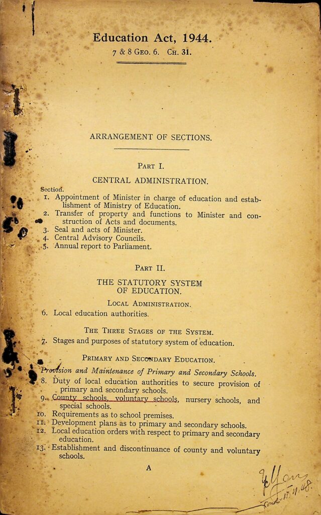 1944年《教育法》是一项全面的法律,旨在改革英格兰和威尔士的公共教育系统。它概述了一个分中央和地方管理的结构,设立了教育大臣和教育部。该法案确立了一个三个阶段的法定教育系统:初等教育、中等教育和继续教育,并规定了地方教育当局提供这些教育的职责。此外,该法案详细规定了义务入学年龄(五岁至十五岁)、学校类型(包括郡立学校和不同类别的志愿学校)、宗教教育的要求,以及对独立学校的注册和监管。