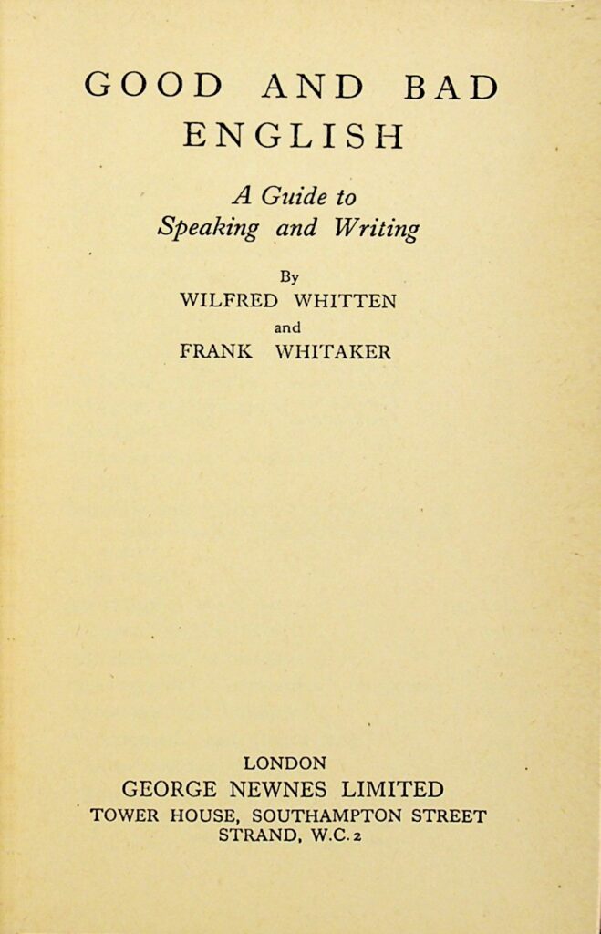 本书名为《好与坏的英语:口语与写作指南》(GOOD AND BAD ENGLISH: A Guide to Speaking and Writing),由威尔弗雷德·惠顿(WILFRED WHITTEN)和弗兰克·惠特克(FRANK WHITAKER)合著。该书最早于 1939 年出版,并在后续年份重印和发行了多个版本。本书旨在提供关于英语口语和写作的指导。