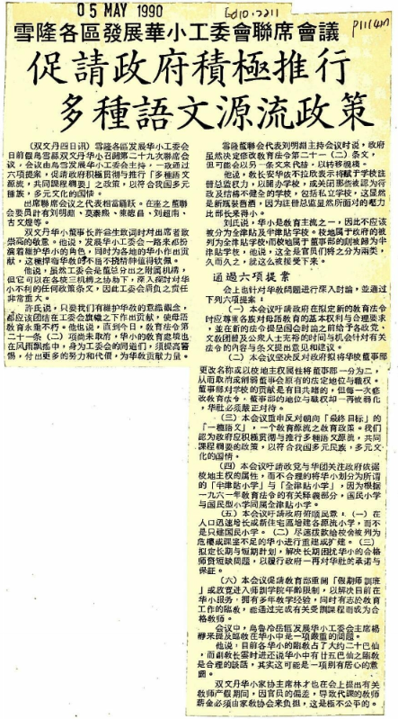 议,会议由乌雪发展华小工委会主持,一致通过六项提案,促请政府积检贯彻与推行「多种文源流,共同课程纲要」之政策,以符合我国多元族,多元文化的国情。