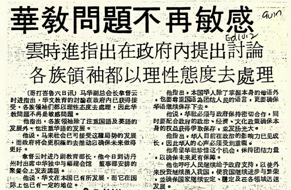 (哥打峇鲁六日讯)马华副总会长拿督云时进指出,华文教育的讨论在政府内已获得接受,各族领袖们都以理性态度去处理。因此华教问题不再是敏感问题。