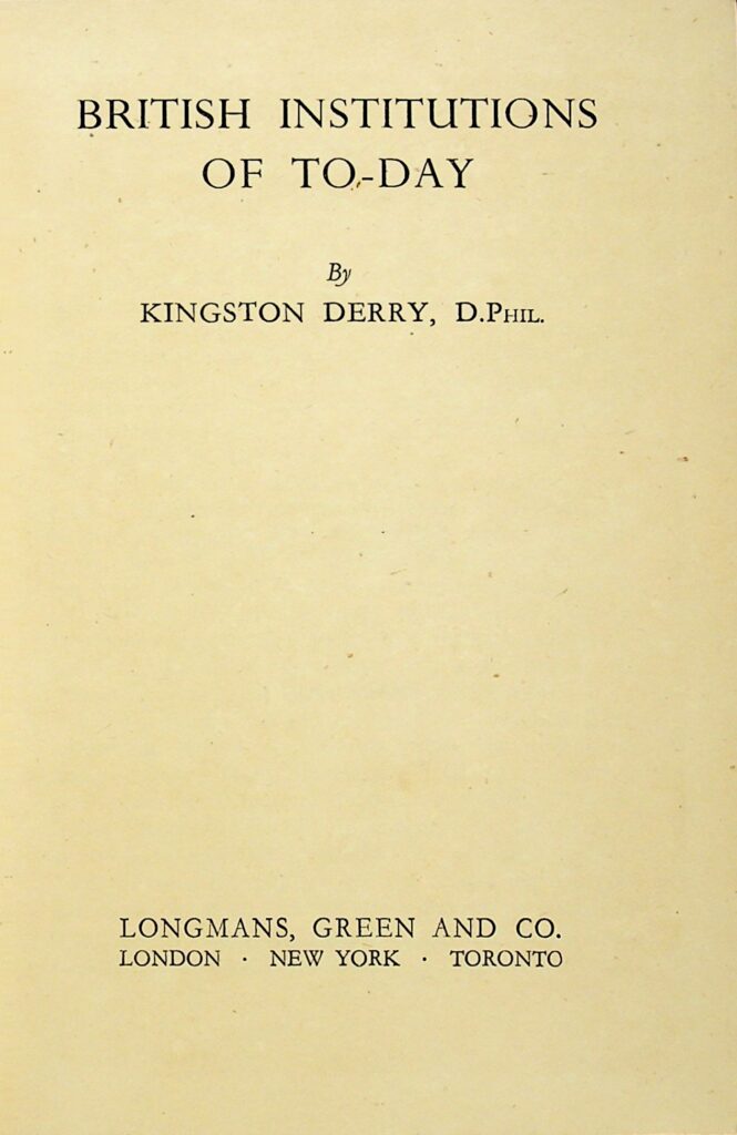 D.Phil. KINGSTON DERRY 撰写的《今日的英国制度》(BRITISH INSTITUTIONS OF TO-DAY)一书的内容。该书最初于 1937 年出版,并于 1947 年发行了“修订和扩充的新版”,其中增添了关于“政府的新趋势”(New Trends in Government)的章节,以应对战后局势。